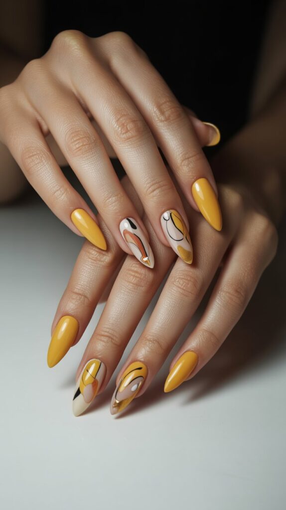 Use swirls, splashes, or brush strokes of complementary colors over butter yellow nails. This creates a unique, gallery-inspired manicure.