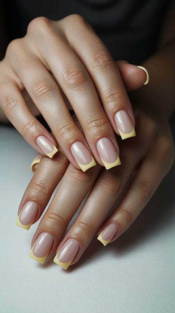 Twist the classic French manicure by using butter yellow tips instead of white. Pair with a nude or soft pink base for subtle elegance.