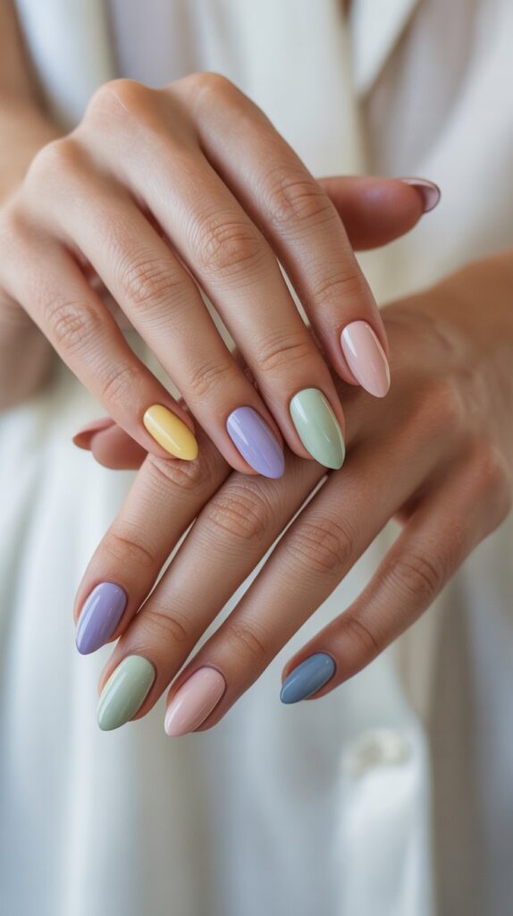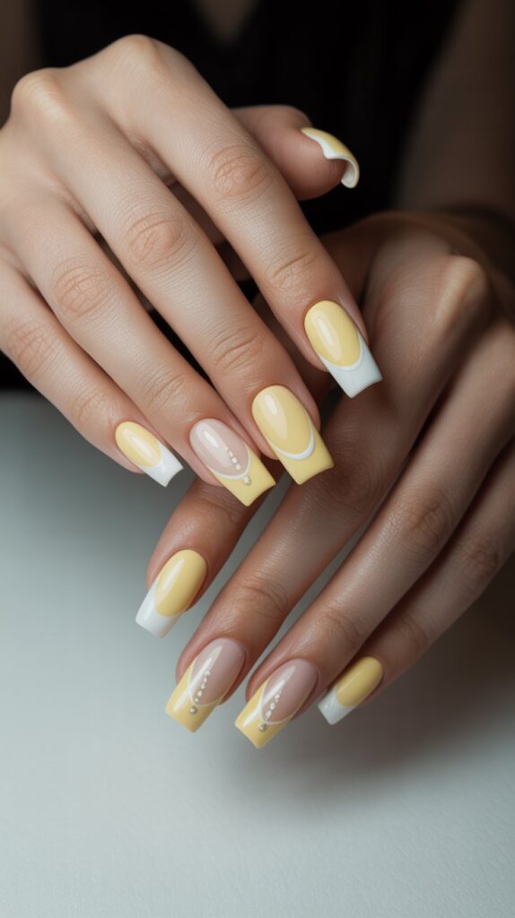 Mix butter yellow with other pastel shades like mint green, lavender, or soft peach. Each nail can feature a different pastel hue for a playful vibe.