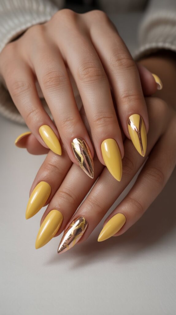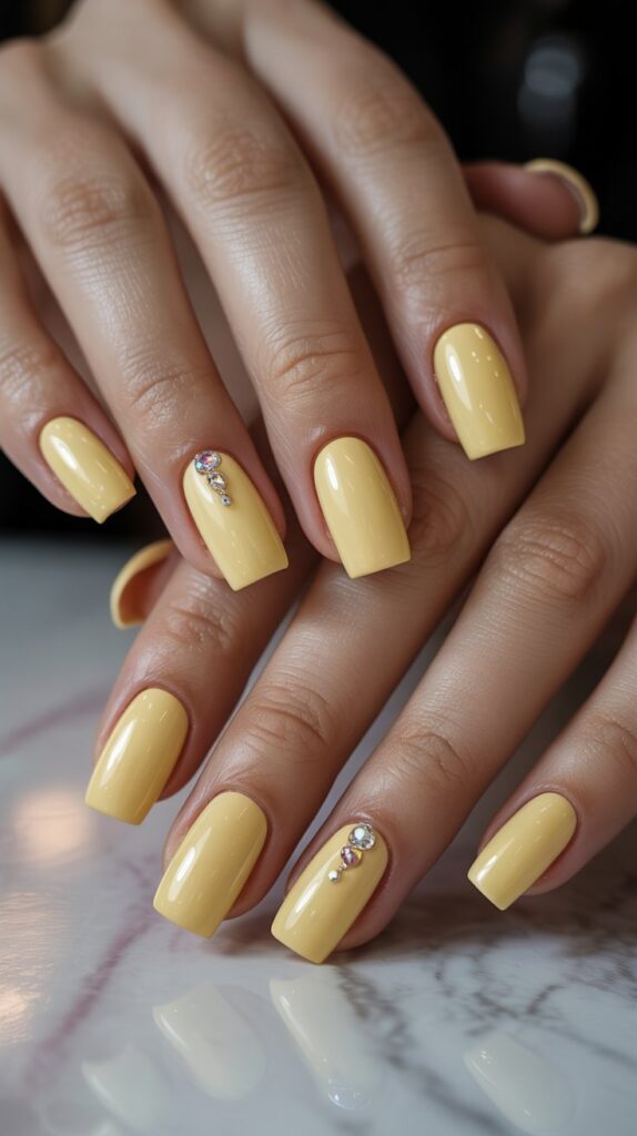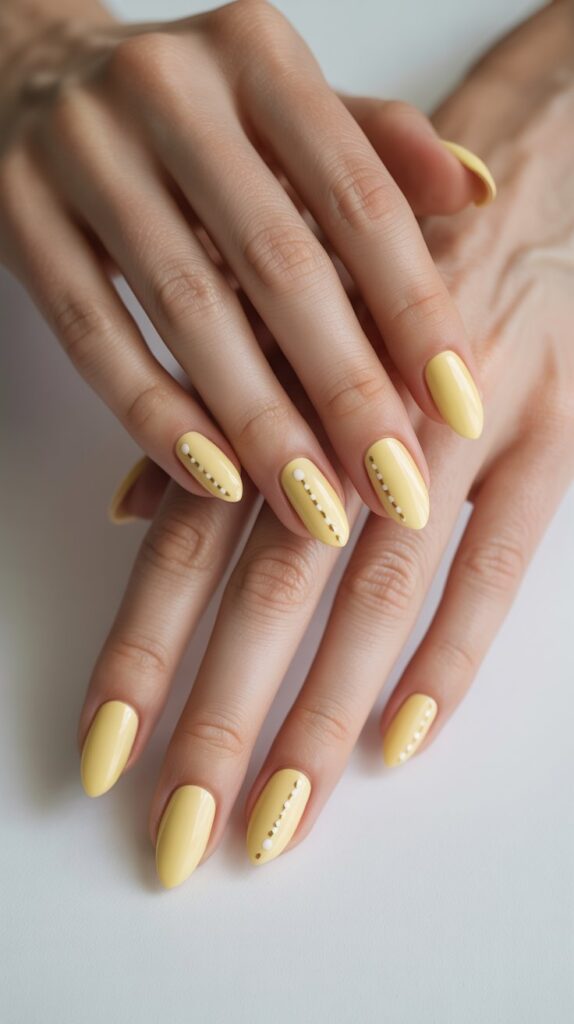Add chrome stripes or small metallic studs. Butter yellow paired with gold or silver adds a luxe vibe to your manicure.