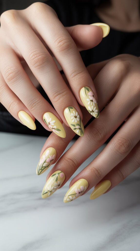 Paint delicate white or pastel flowers on butter yellow nails for a romantic spring vibe. This works especially well for oval or almond-shaped nails.