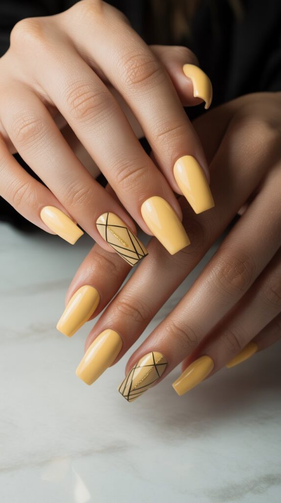 Experiment with stripes, triangles, or abstract shapes. Black, white, or pastel lines on butter yellow nails create a modern and artsy look.