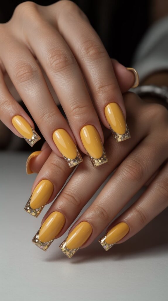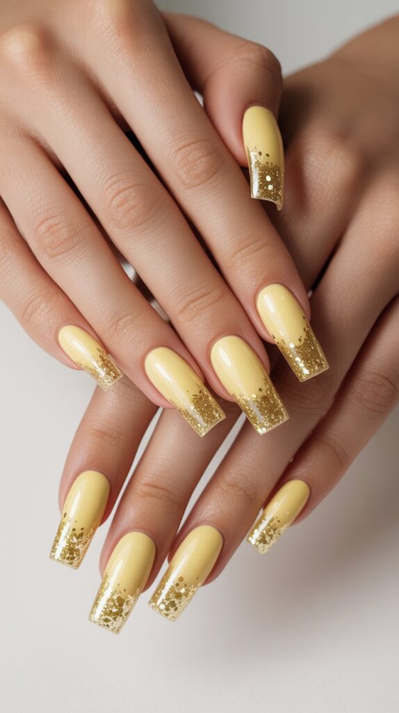 Apply glitter starting at the tips and fading toward the base of butter yellow nails. Perfect for evening events or special occasions.