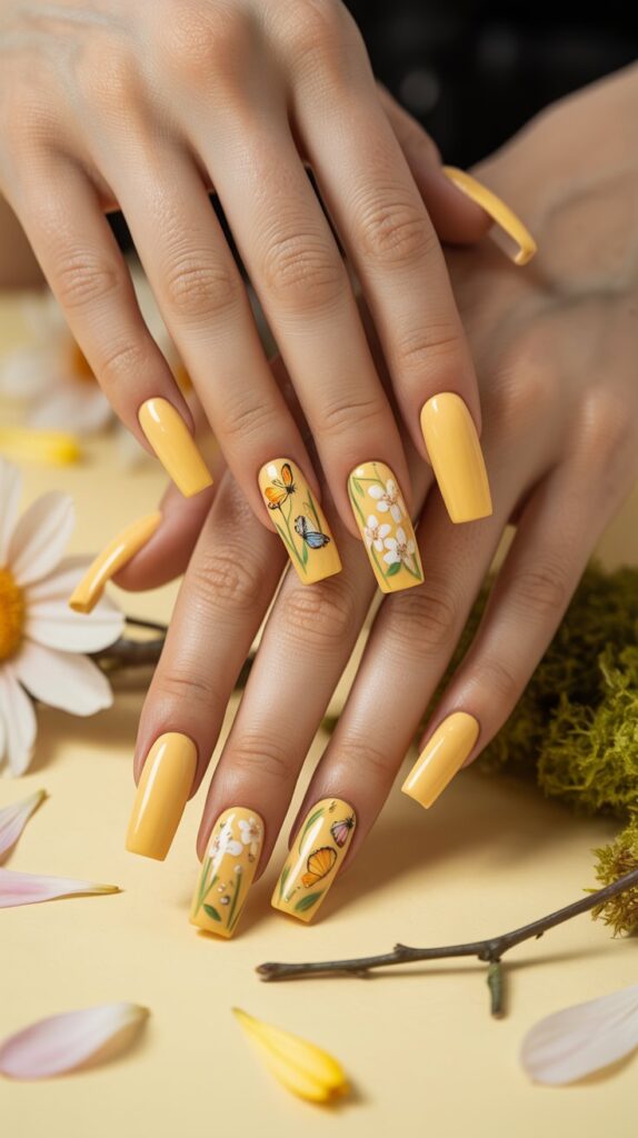 Draw leaves, butterflies, or sun motifs over butter yellow nails. This creates a fresh, organic, and cheerful design that screams spring.