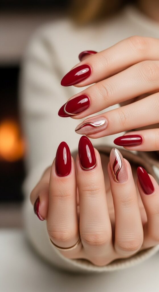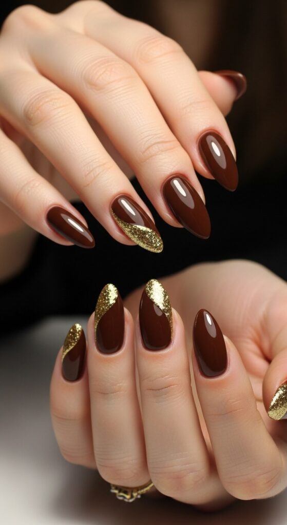 Warm, chocolatey brown is the ultimate cozy shade. It’s like a hot cocoa for your hands. A single line of gold glitter at the base or tip makes it feel special and festive.