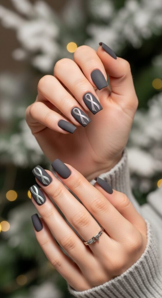 Graphite grey is such an underrated winter shade. It’s sleek and powerful. Adding a thin, metallic silver ribbon across the nail gives it an artistic, architectural feel.