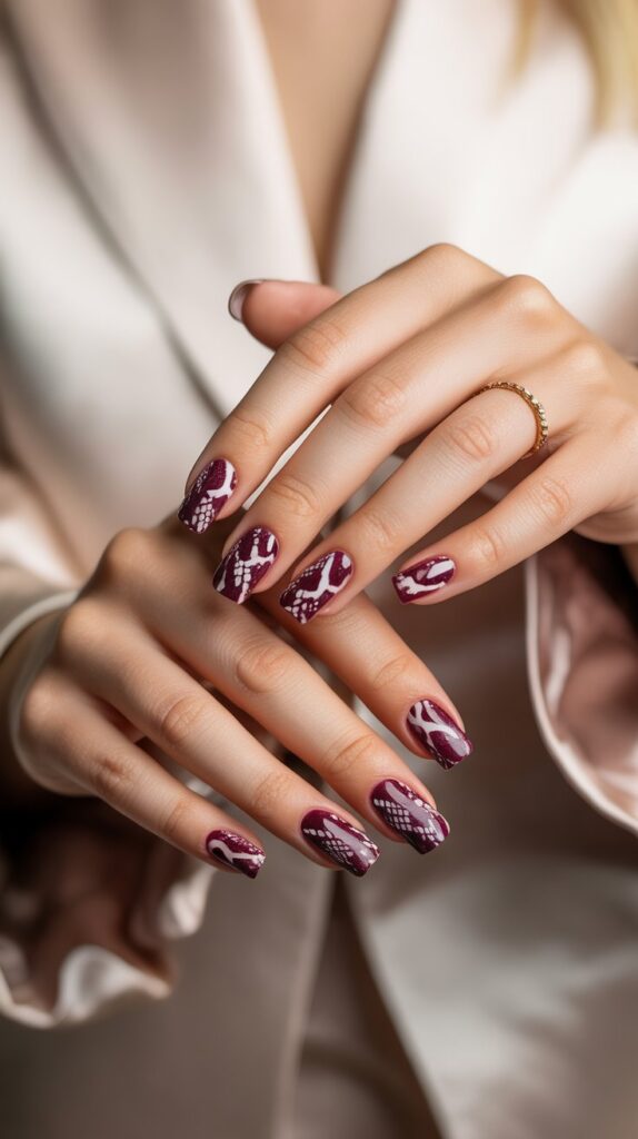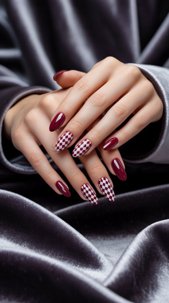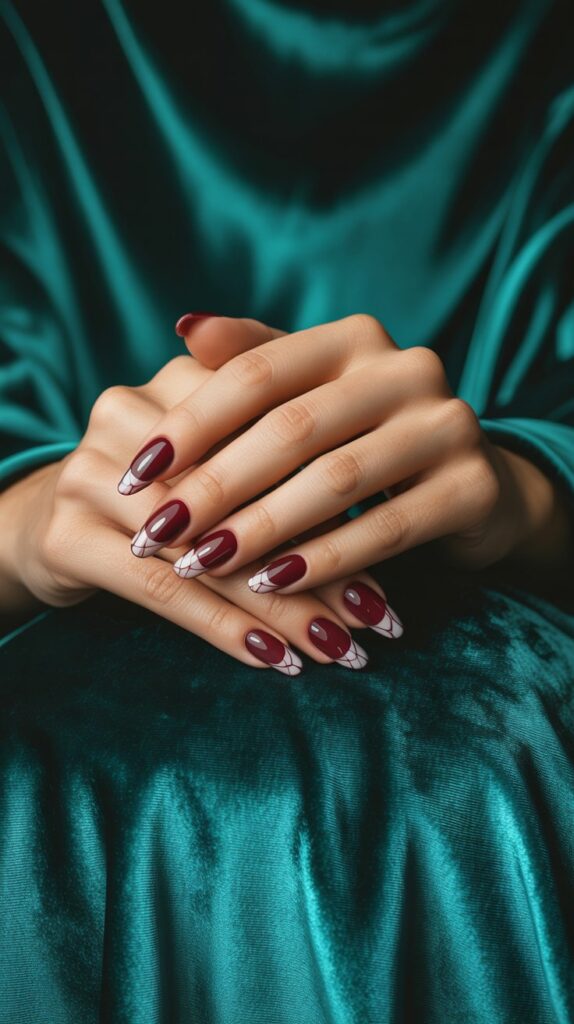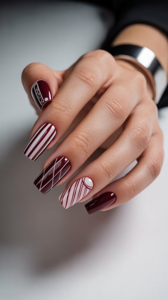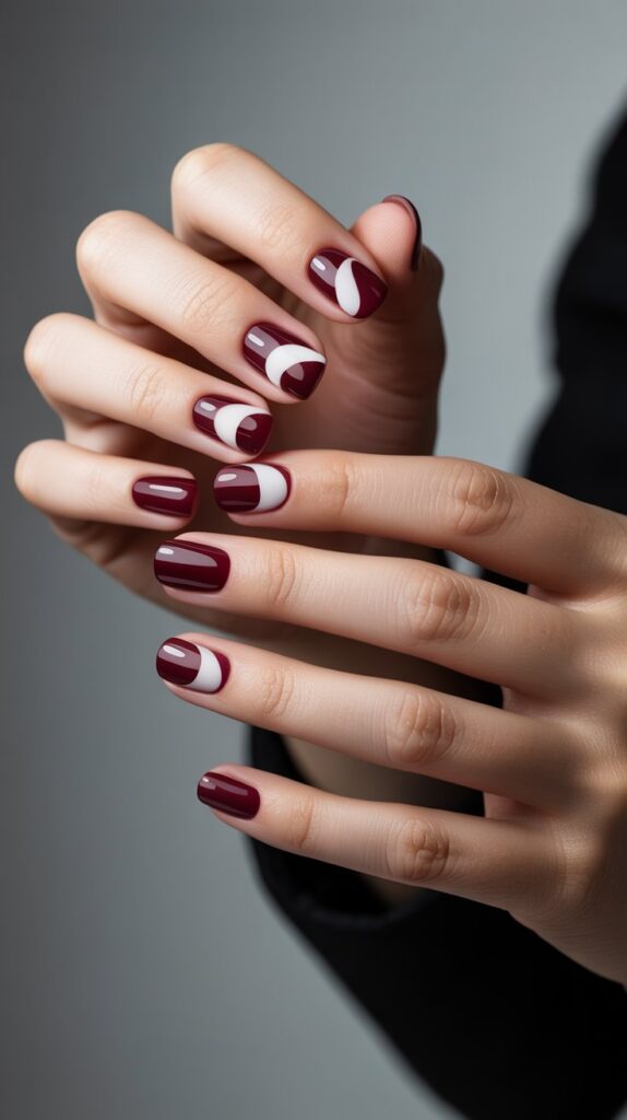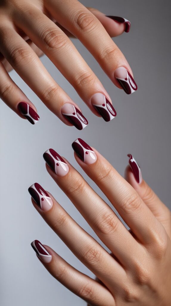 If you’re into modern, edgy vibes, geometric burgundy and white nails are your best friend.