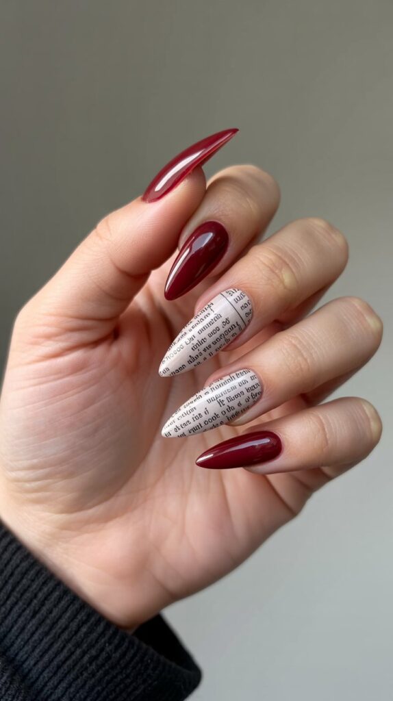 22. Burgundy & White Newspaper Nails