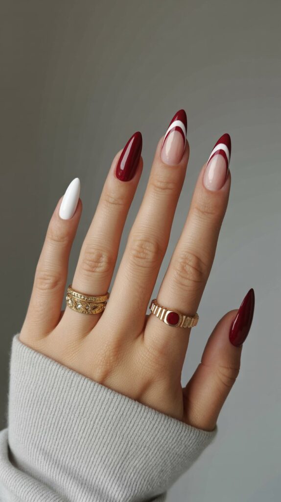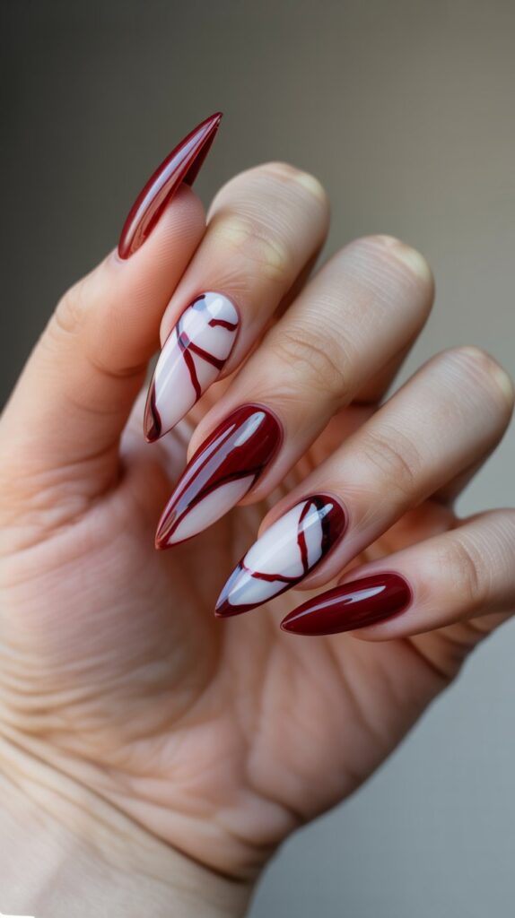 17. Burgundy & White Stiletto Nails