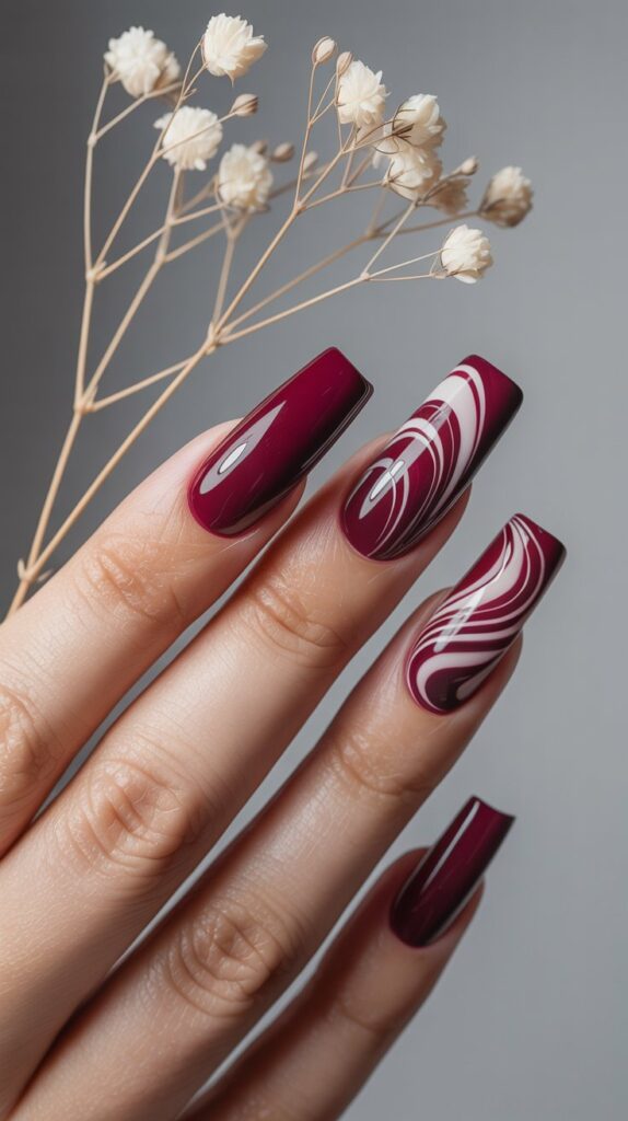 - Use a water marbling technique or a sheer white polish swirled over burgundy.