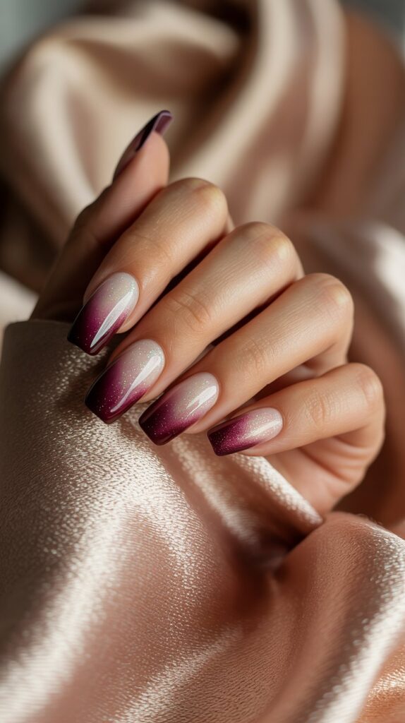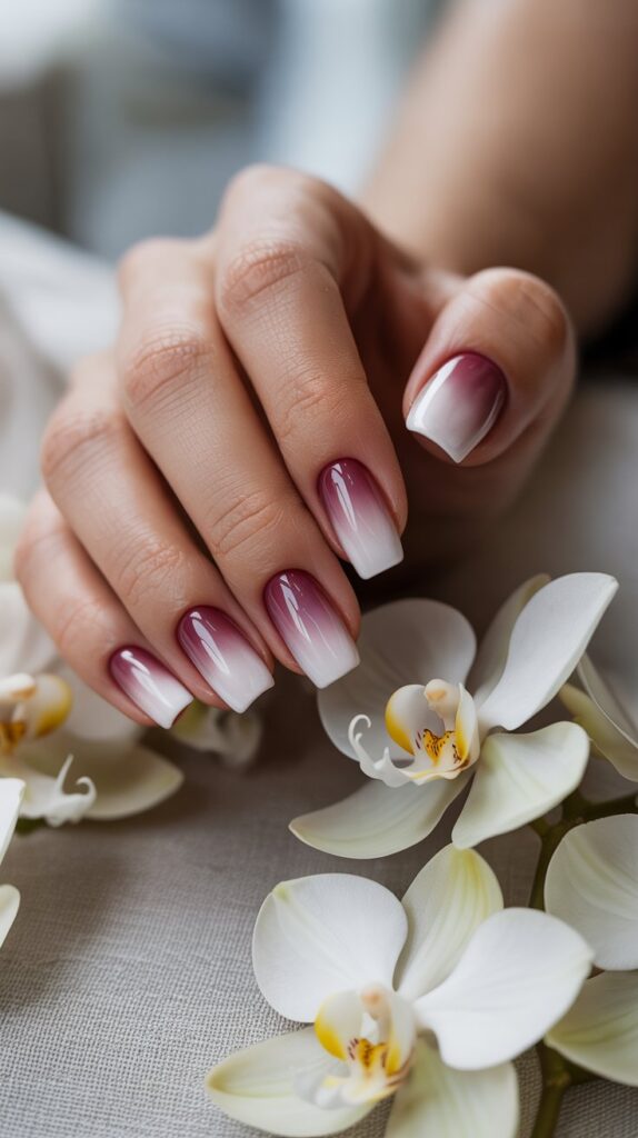 - Ombré fade from burgundy at the cuticle to white at the tip.