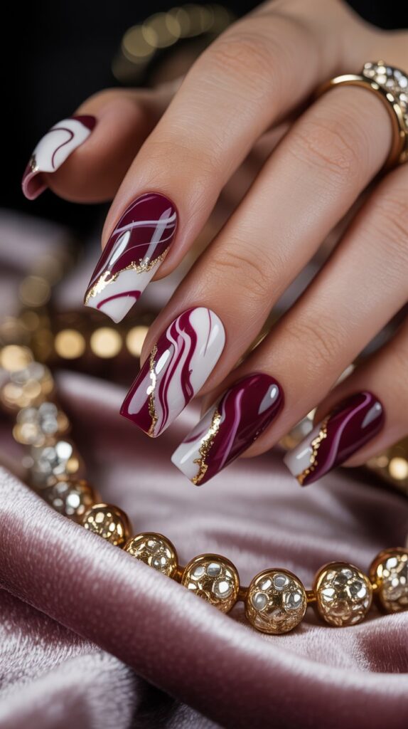 Marble nails = instant luxury. And when you mix burgundy and white with a touch of gold? Chef’s kiss.