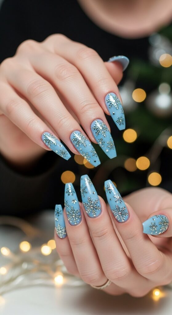 Think of this as your personal winter wonderland, minus the cold fingers. A sheer, icy blue base serves as the perfect backdrop for delicate, hand-placed crystal snowflakes.
