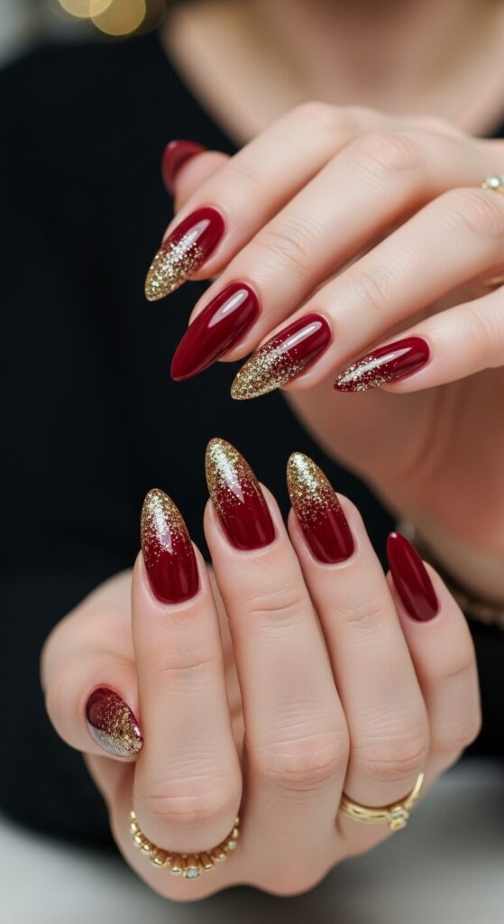 1. Classic Crimson & Gold Glitter Tips
