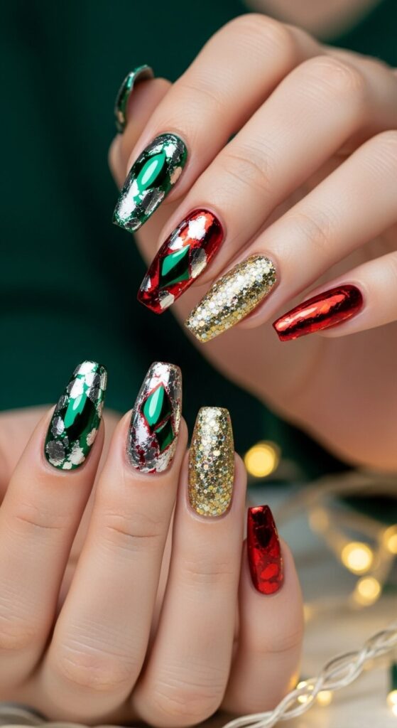 This look mimics the fancy foil wrapping paper. Use a metallic silver or gold as your base and add patches of contrasting glitter to create a crumpled foil effect. It’s edgy and festive.
