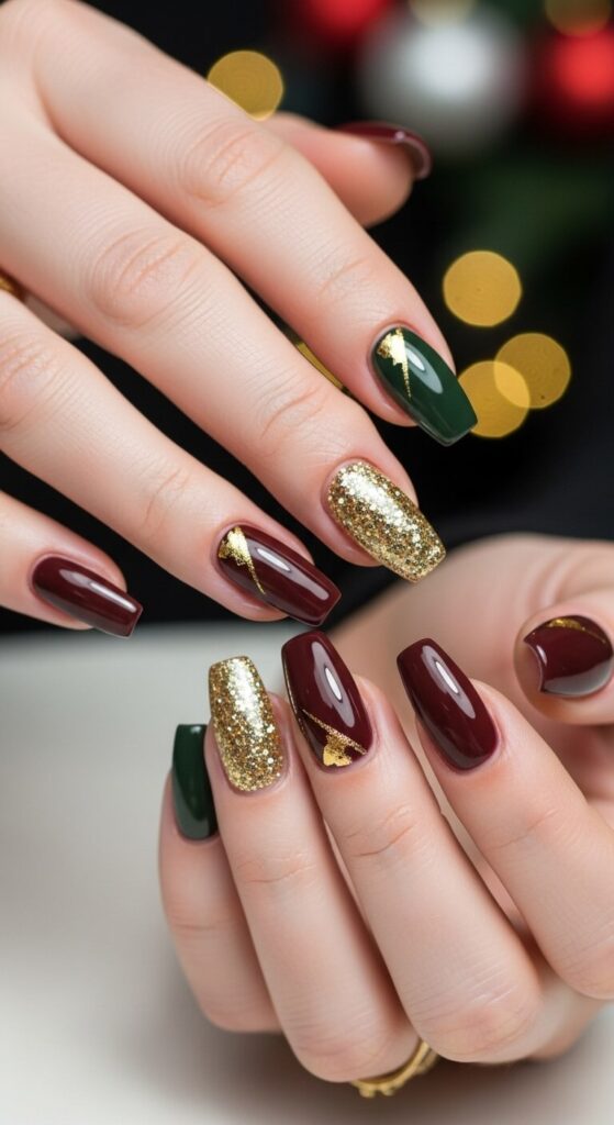 My go-to combo is a deep burgundy on four nails and a rose gold glitter on the accent nail. It feels expensive and looks incredible against holiday party lighting.
