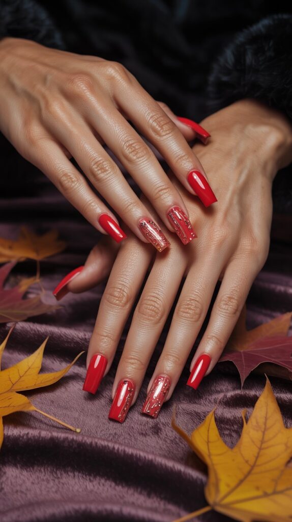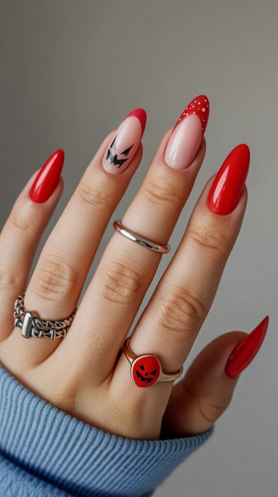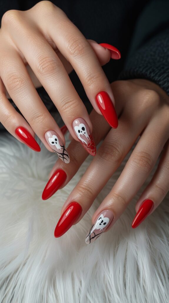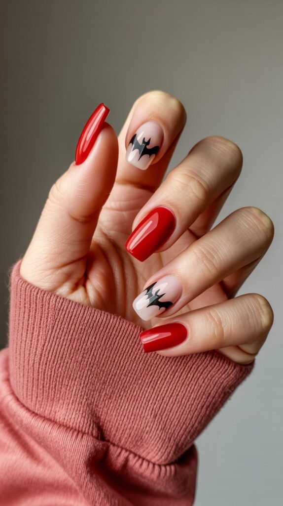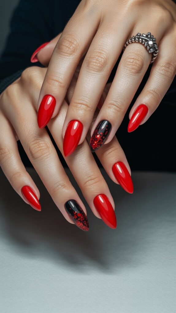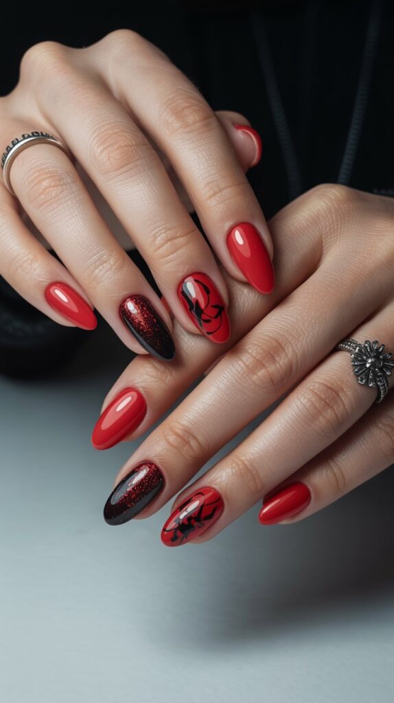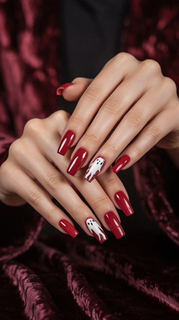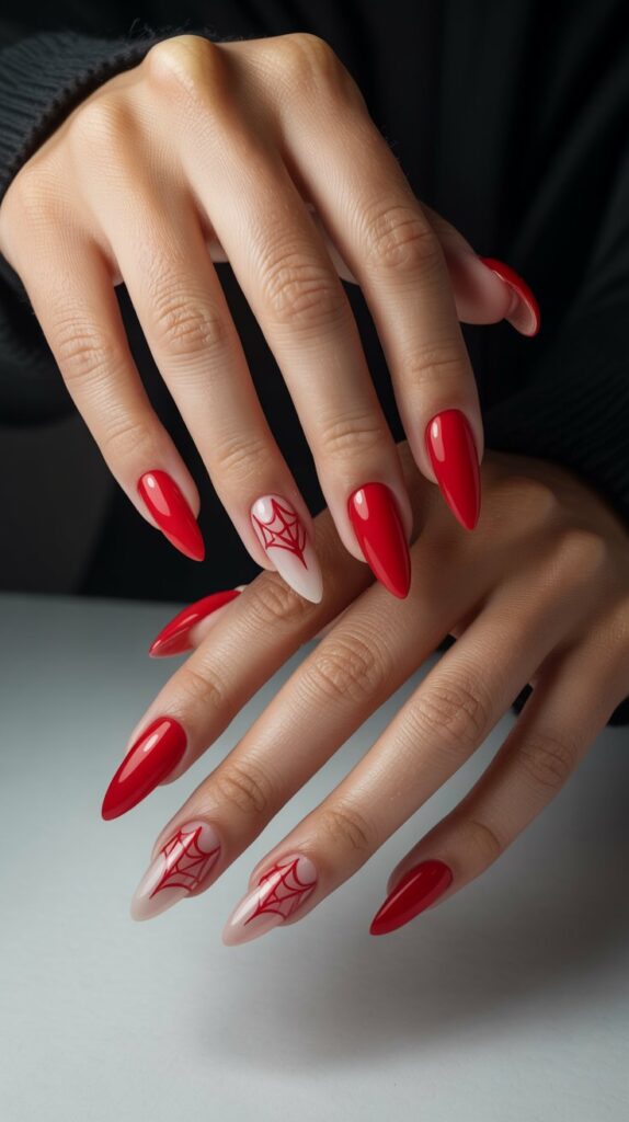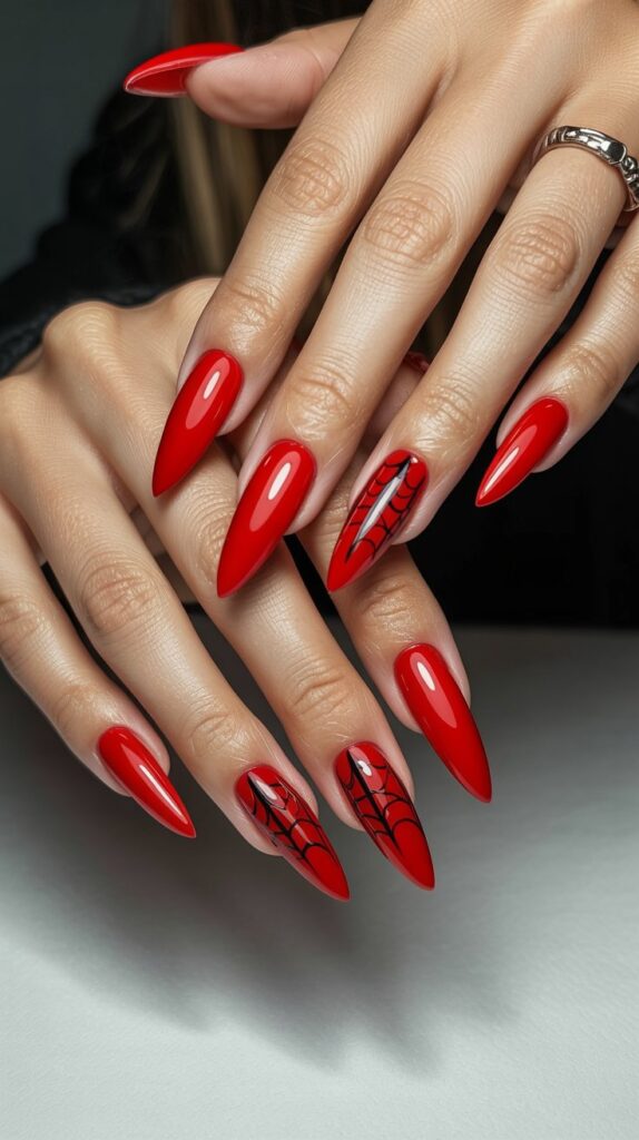 A high-shine, deep red base is always a winner. But adding a single matte black spiderweb on an accent nail? That’s next-level Halloween vibes without being too on-the-nose.