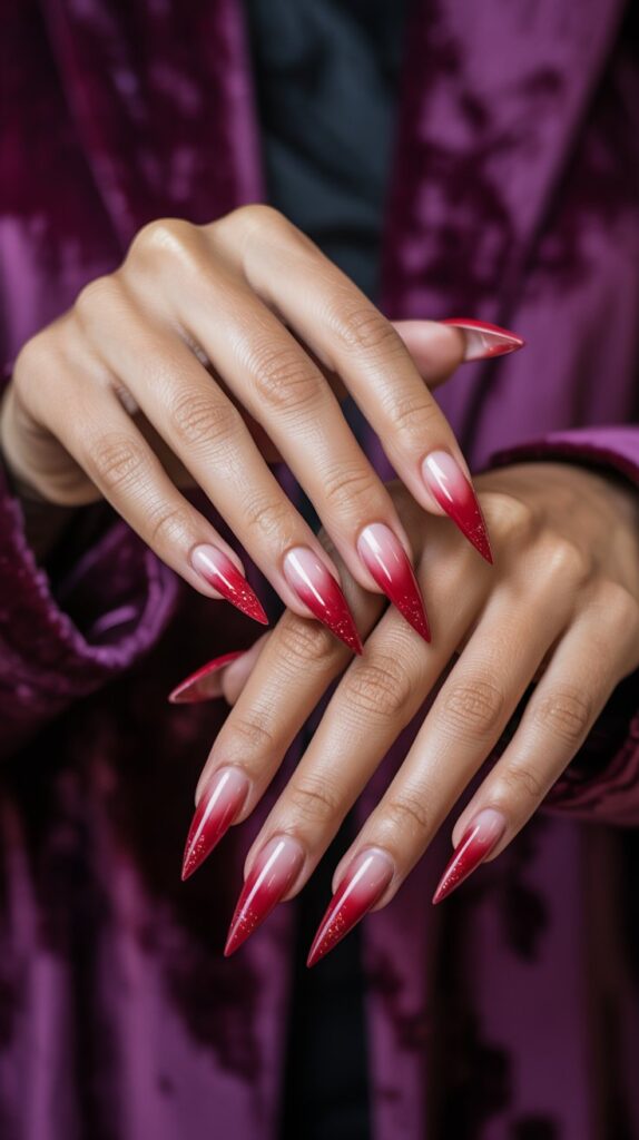 Imagine a gradient that goes from deep, vampy plum at your cuticles to a bright,血腥 crimson at the tips. It’s moody, dimensional, and has serious vampire royalty energy.