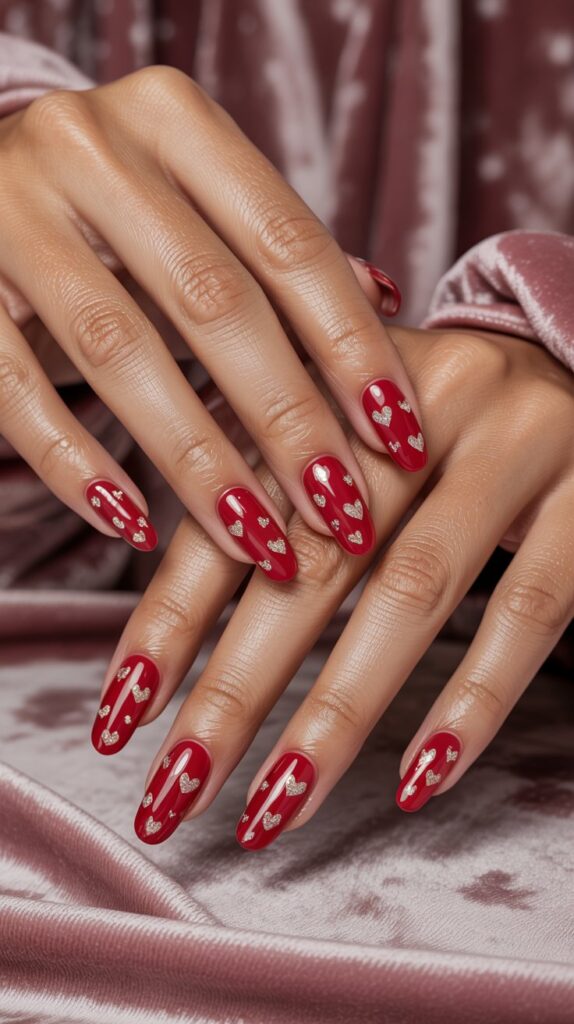 This design is so cute it’s almost unfair. A squishy, translucent red jelly polish makes your nails look like delicious gummy candies. Then, add different sizes of black and red glitter hearts that look like they’re suspended inside.