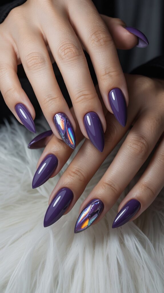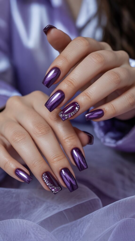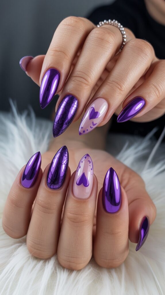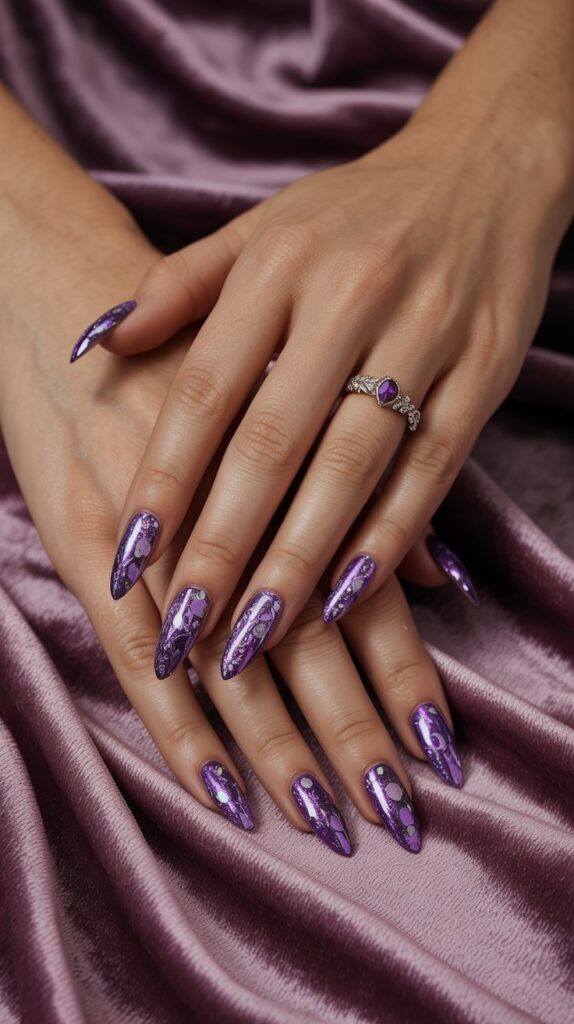 Feeling extra? A sharp metallic purple chrome is the ultimate power move. It reflects every light, giving off serious vampire royalty or futuristic witch energy.