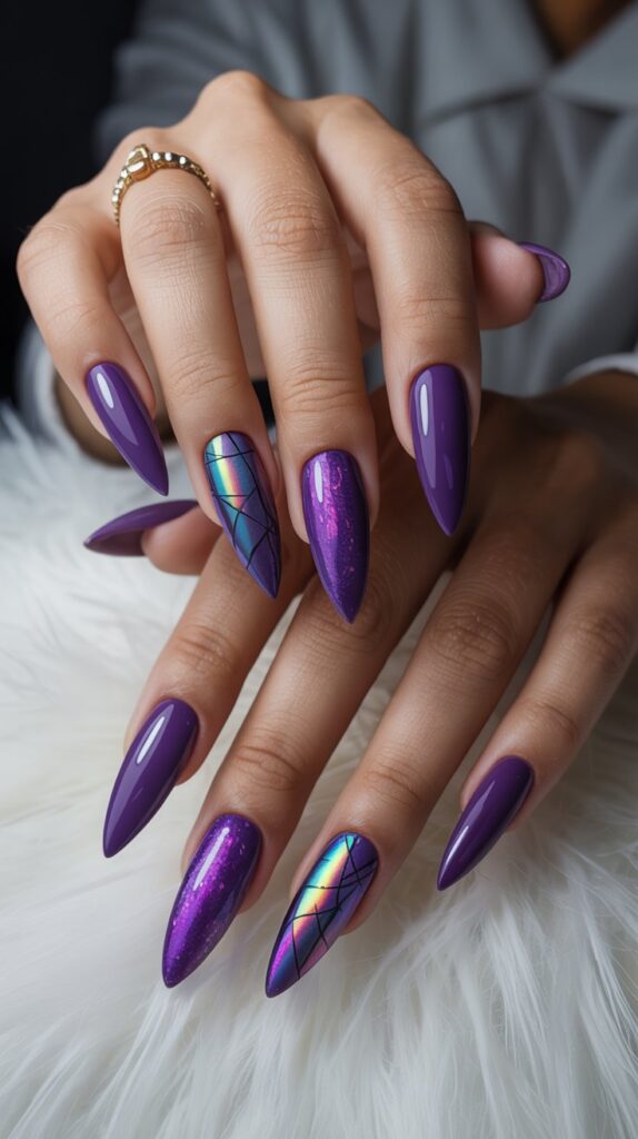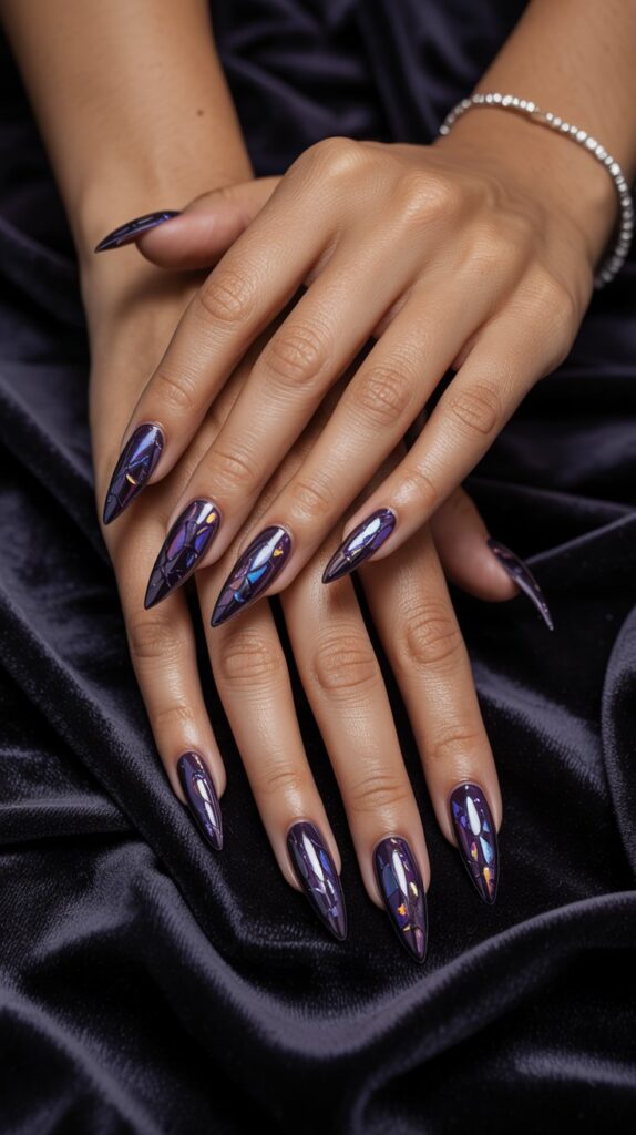 This design is absolutely mind-blowing. A deep, almost-black purple base makes the perfect background for holographic “shattered glass” flakes. It’s dramatic, edgy, and magical.