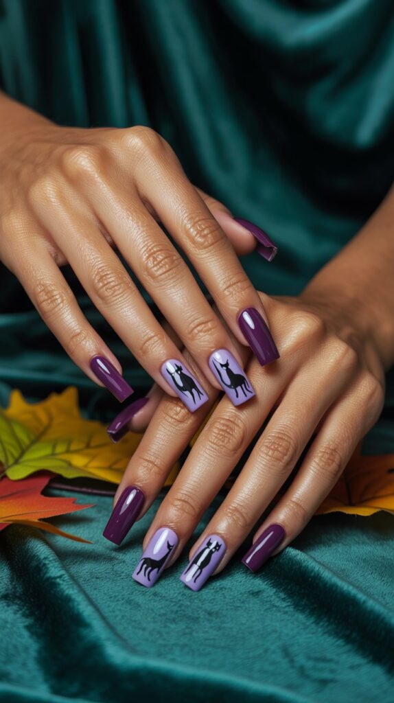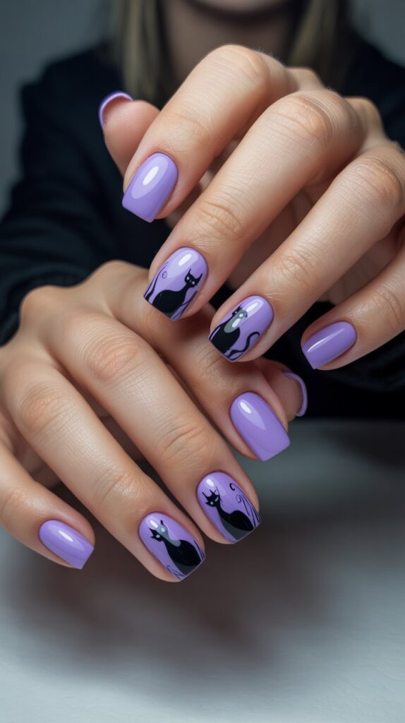 This combo is adorable. A soft, creamy lavender base keeps it light, while simple black cat silhouettes add that essential Halloween flair.