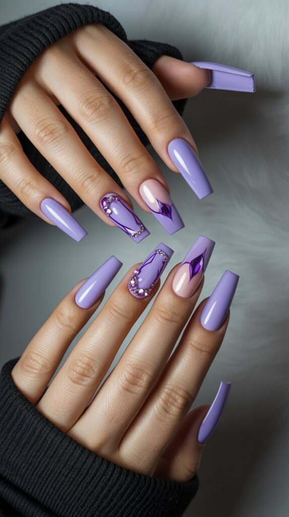 Feeling glam? A soft lavender base is the perfect canvas for an arrangement of different-sized purple rhinestones. Place them like a constellation on your ring finger.