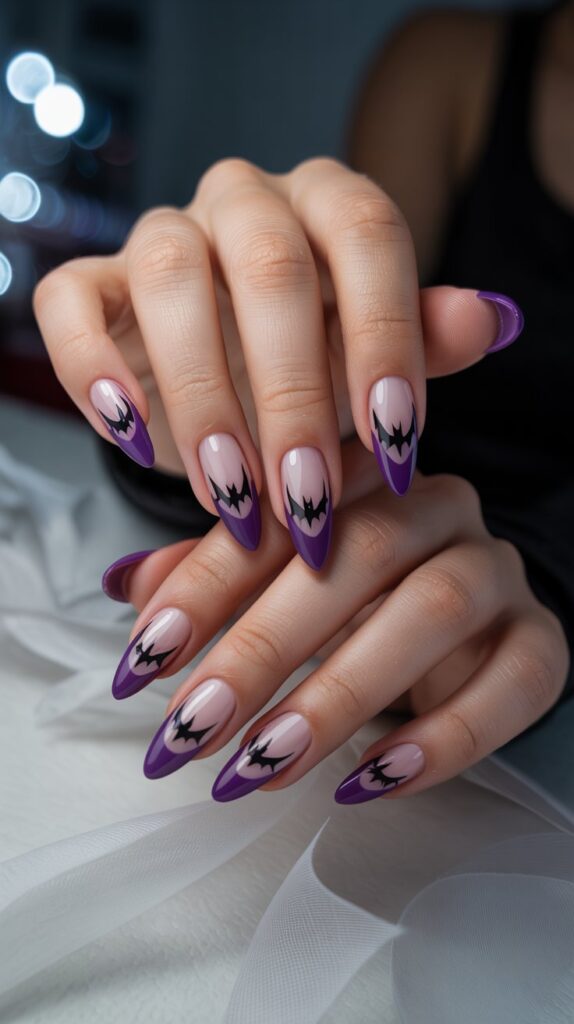 9. Purple French Tips with Bat Details