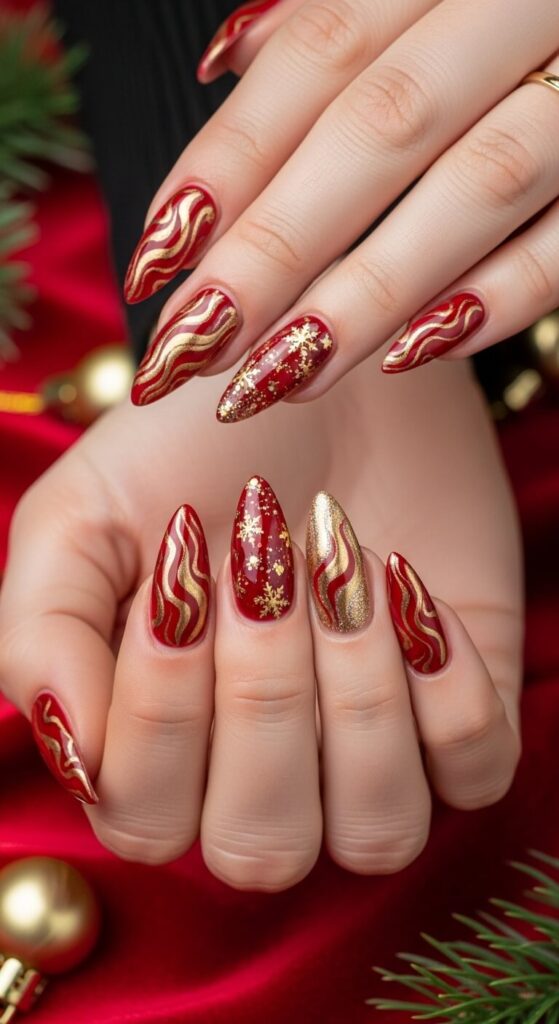 Feeling luxe? This combo is the epitome of holiday glam. It looks expensive, complex, and is surprisingly easy to achieve with water marbling or a simple stamping plate.