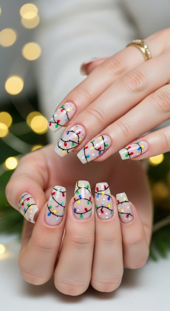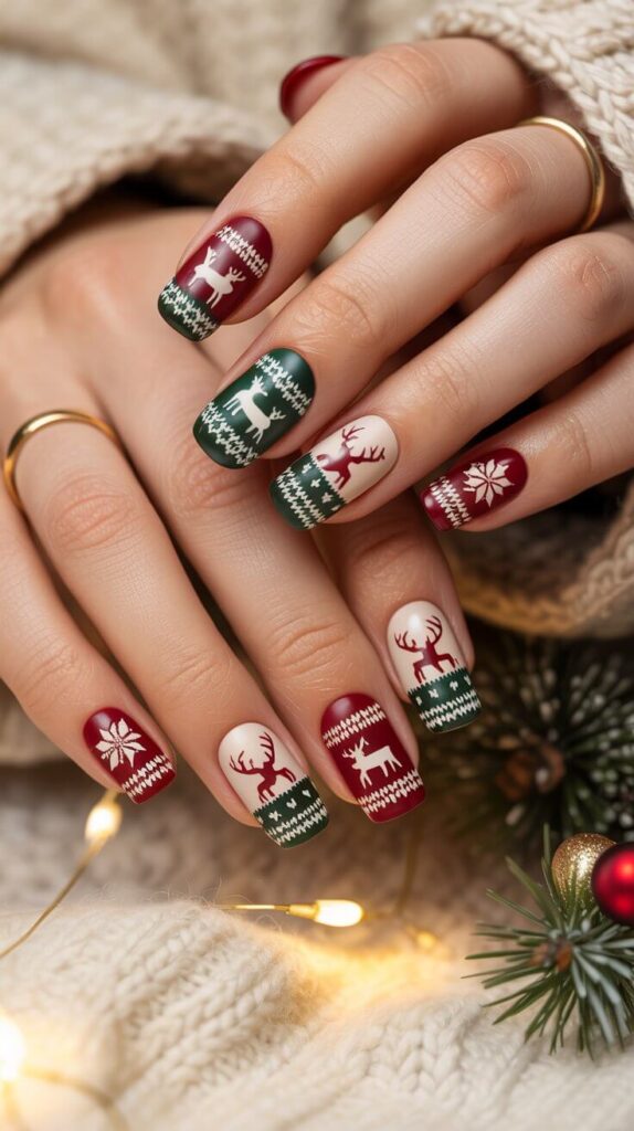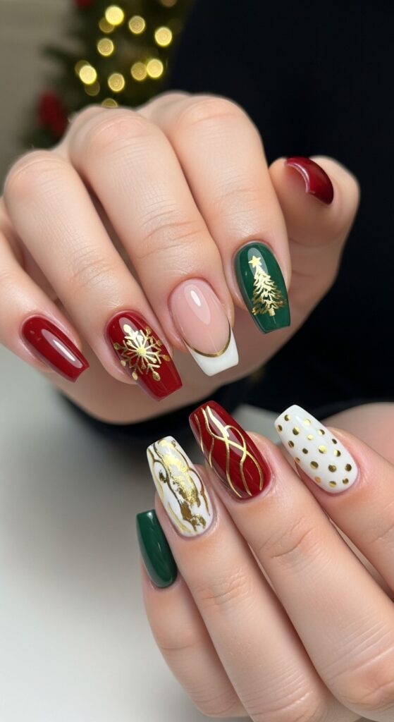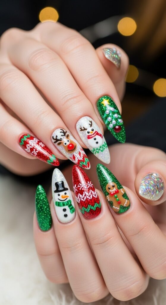 Can’t decide on just one design? Don’t! A Skittles manicure lets you mix and match all your favorite cute Christmas nail ideas on one hand. It’s the ultimate “why choose?” solution.