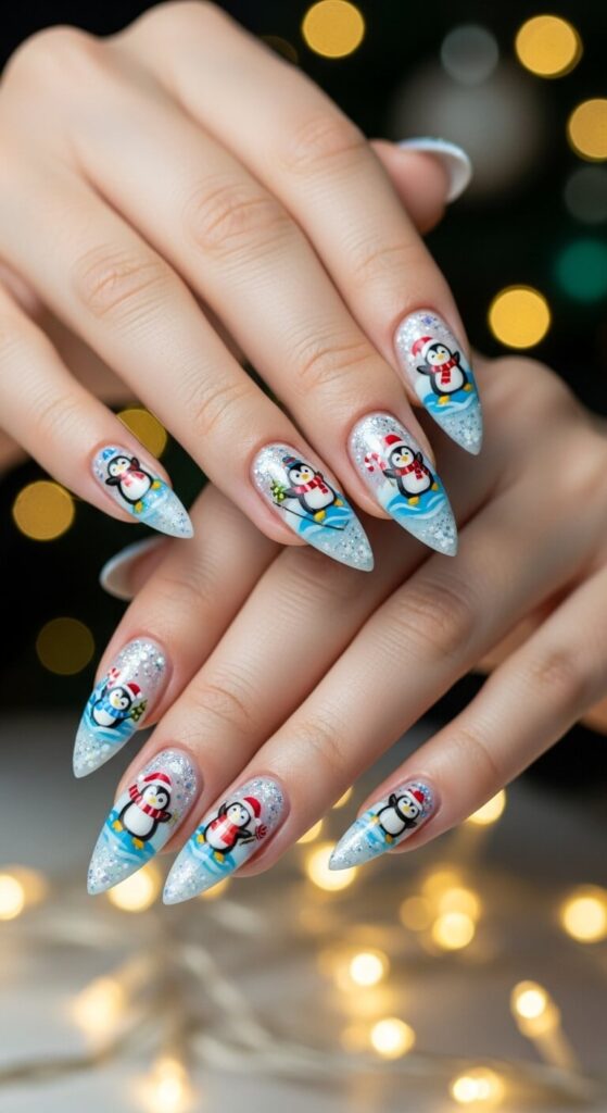 I like to put a single penguin on each ring finger and keep the other nails a solid, icy blue. It balances the cuteness perfectly.