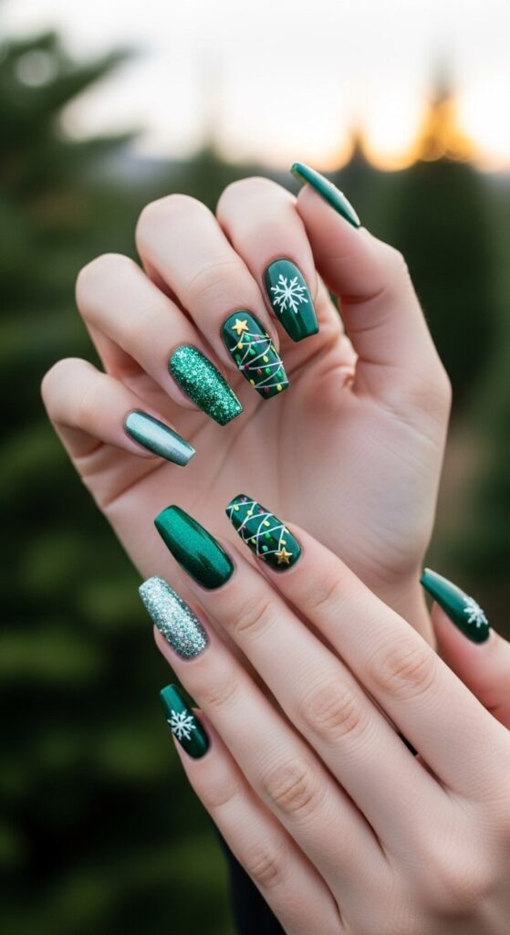 Turn your nails into a tiny, festive forest. Paint a variety of Christmas trees on each nail—from simple triangles to detailed pines with tiny star toppers and glittering ornaments.