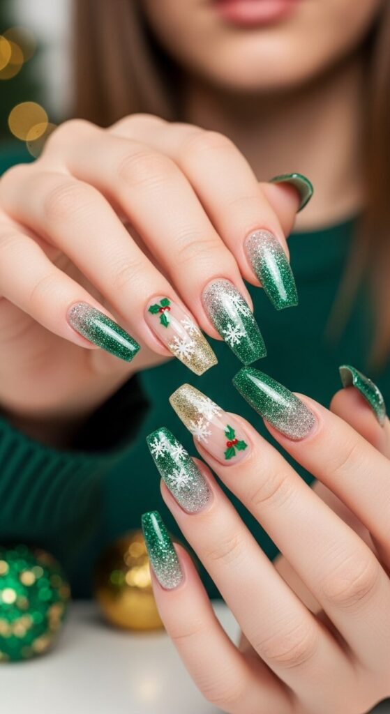 Why commit to a full glitter nail when you can just dip your tips? A hunter green base gets a gradual dusting of gold or emerald glitter fading up from the tips. It’s chic, it’s festive, and it’s way easier to remove than a full-glitter manicure.
