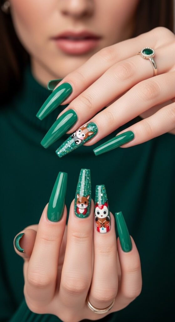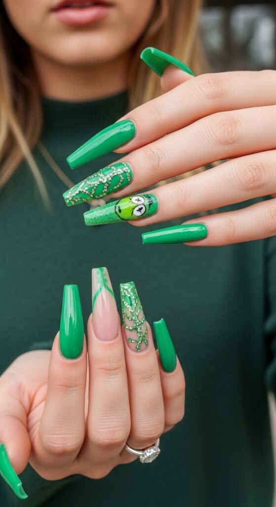 IMO, this is the funniest and most creative of the Green Christmas Nail Designs. It’s a total conversation starter and shows you don’t take the holidays too seriously.