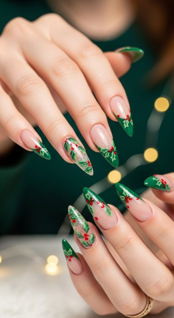 Give the classic French manicure a festive makeover. Instead of a white tip, paint a deep green one and add tiny, perfect red holly berries with delicate green leaves along the smile line.
