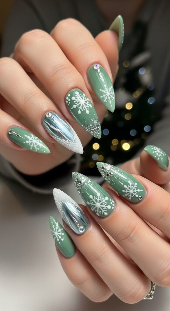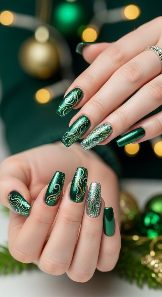 Forget plain polish—this is all about liquid metal. A shimmering, metallic green, like liquid emerald or a shimmery pine, looks luxurious and expensive. It reflects light beautifully and looks amazing in Christmas party photos.