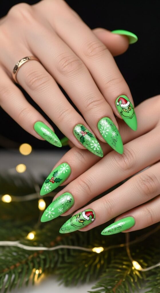Feeling a little edgy? A high-voltage, neon green manicure is a rebellious take on the holiday. Add some black accent lines or a single “Grinch” word in script for maximum effect.