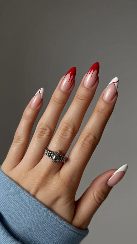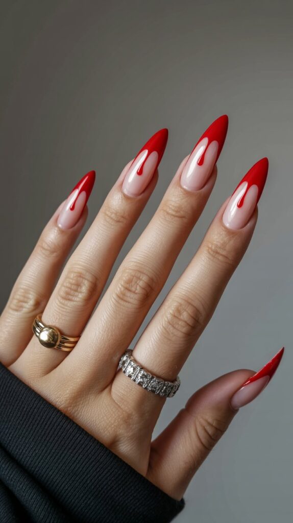Pro tip: Use a thin nail art brush or even a toothpick to create the drips for more control. A quick top coat will blend the drips seamlessly into the red base.