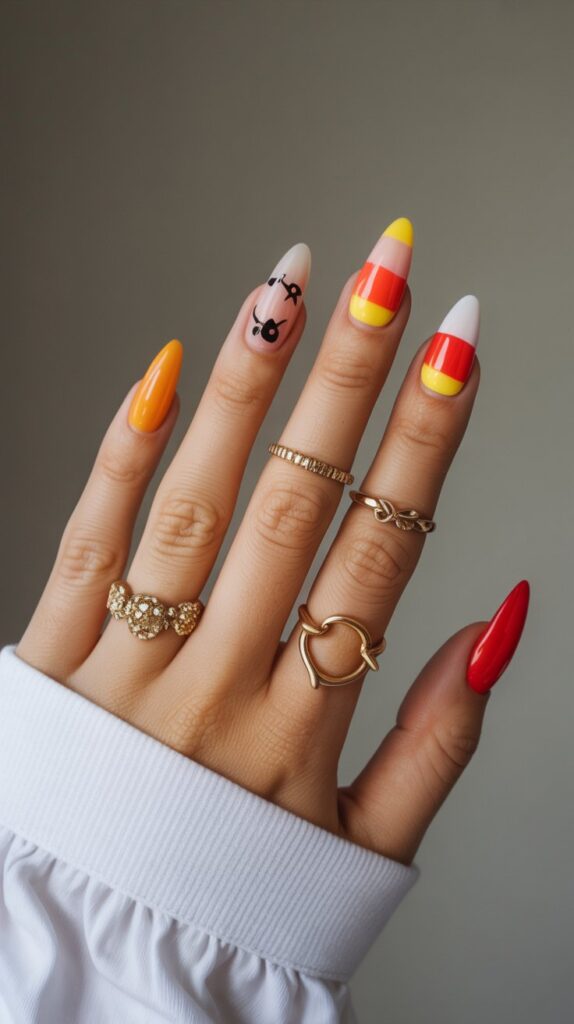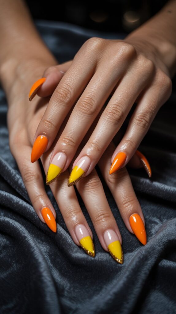 Love it or hate it, candy corn is a Halloween icon. And on nails? It’s surprisingly chic. This design uses a color block technique that is bold, fun, and incredibly festive.