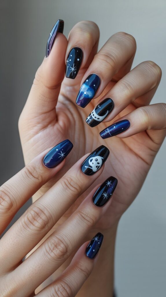 - Add a tiny crescent moon or a flying witch silhouette on an accent nail.