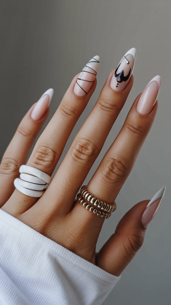 - Use a striping brush or a very thin nail art pen to create irregular white lines on a black or nude base.