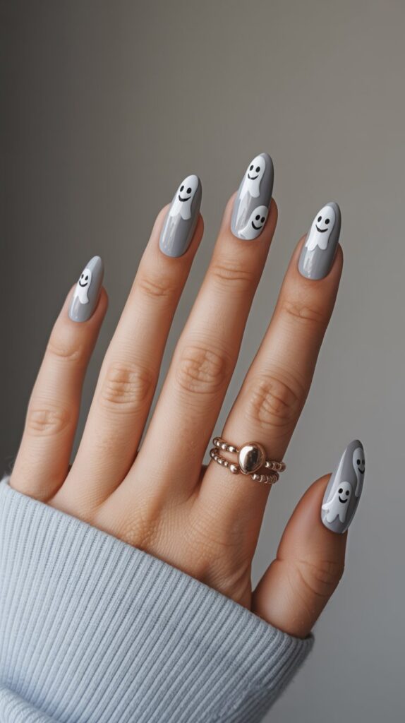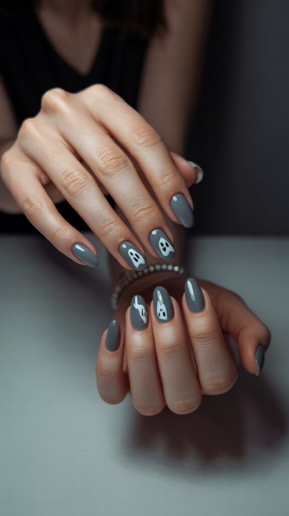Pro move: Use a matte top coat over the grey base to enhance that “foggy” feel, but use a glossy top coat just over the ghosts to make them pop.