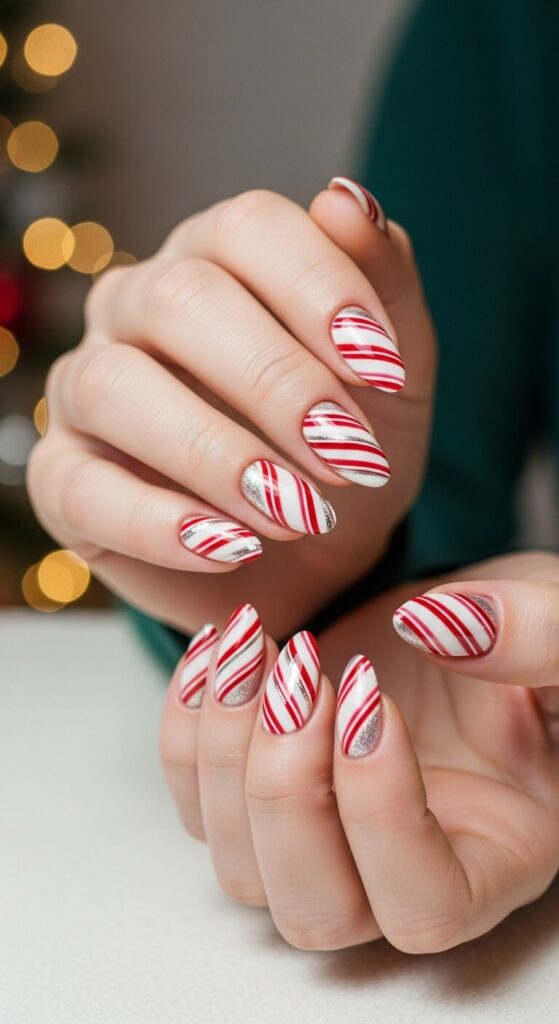 It doesn’t get more classic than this! Thin, swirling red and white stripes are playful, sweet, and undeniably festive. On short nails, the stripes look even cuter and more condensed.