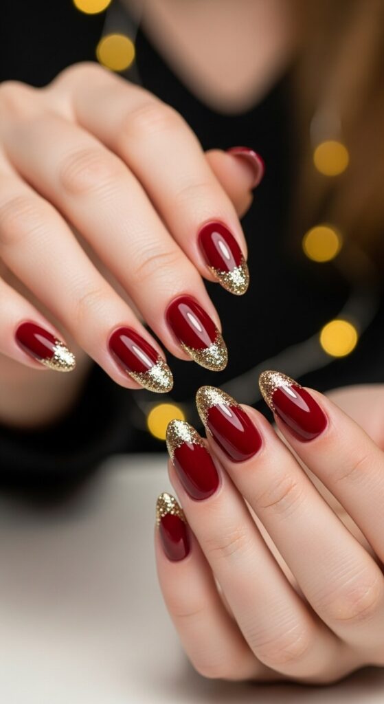 1. Classic Crimson & Gold Glitter Tips