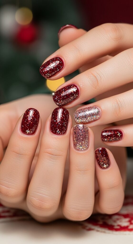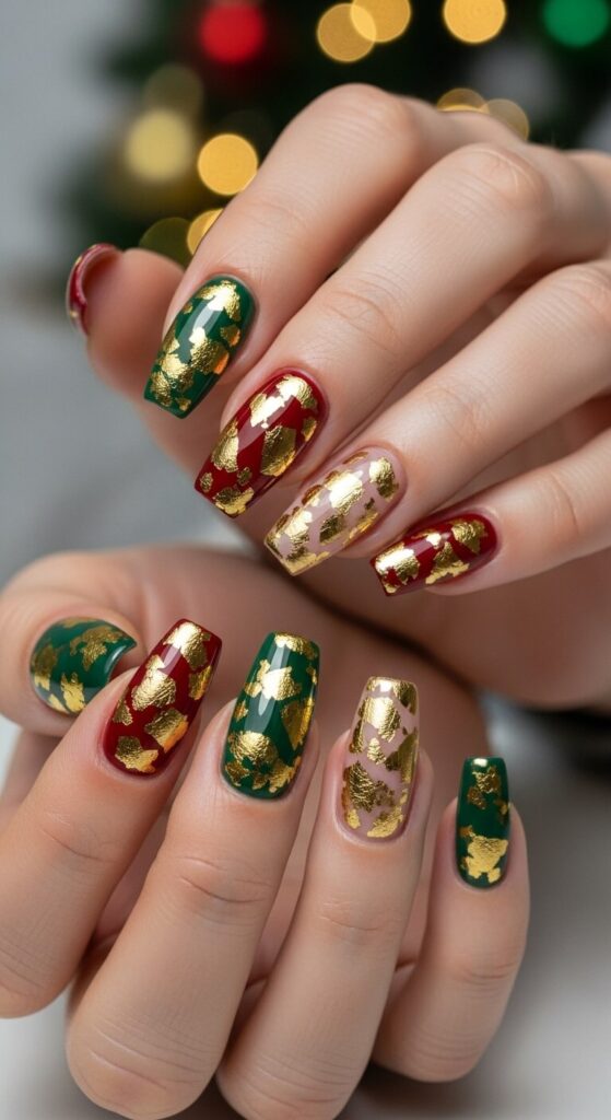 This look is pure, crushed-up holiday magic. A deep burgundy or navy blue base with flecks of real gold leaf pressed on top? Absolutely breathtaking.