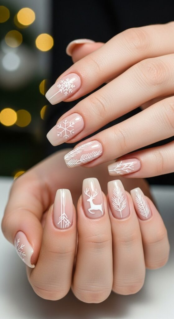 Picture this: a milky white base with a single, delicate reindeer silhouette stamped or drawn on. It’s minimalist, storybook cute, and so easy to wear.