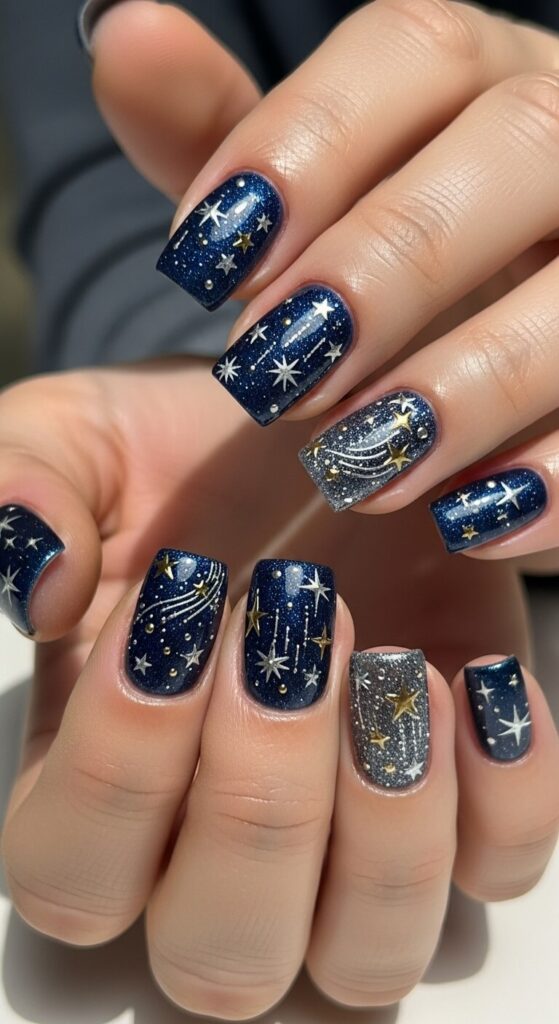 - A scattered holographic glitter top coat can add extra “starlight.”