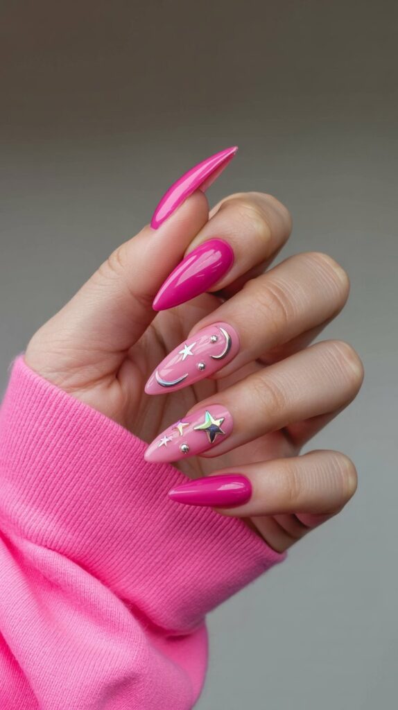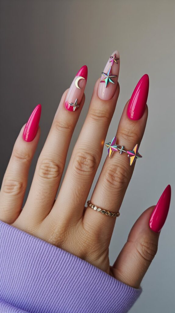 Lean into the mystical side of Halloween with a cosmic theme. This look is all about celestial magic with a powerful pink punch.