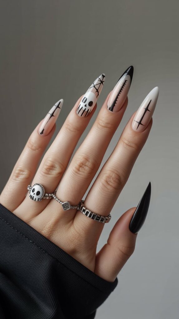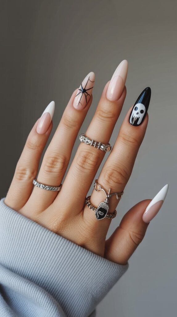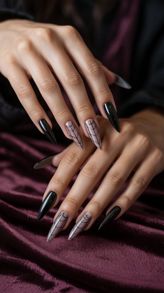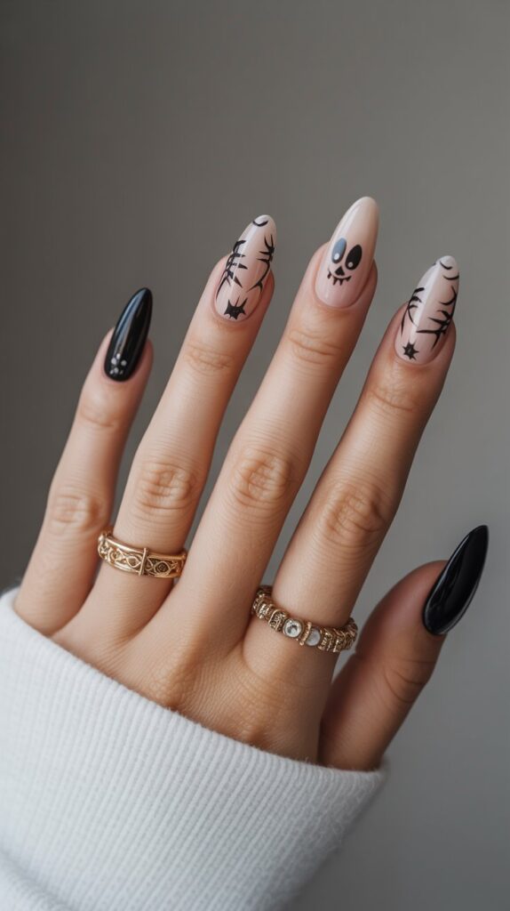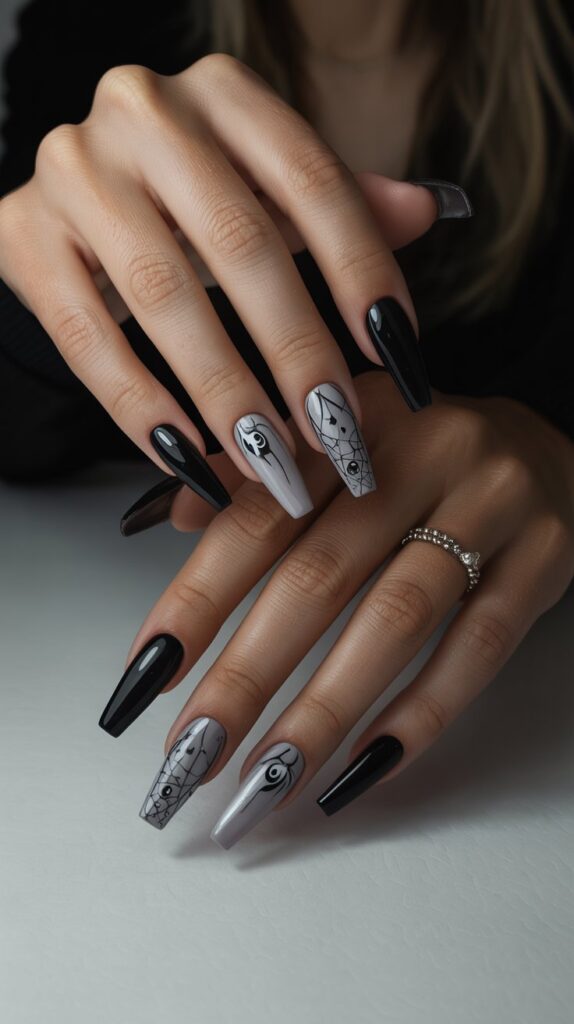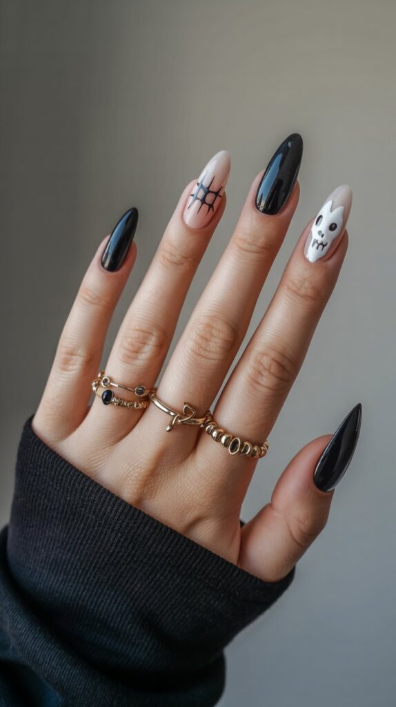 • It focuses the spooky element on one nail, keeping the overall look balanced and chic.