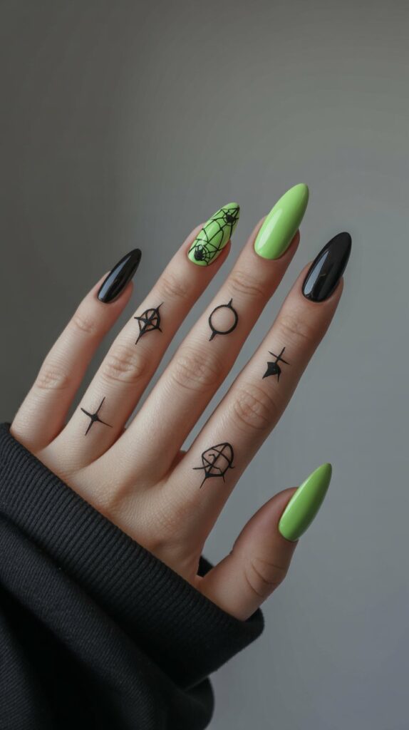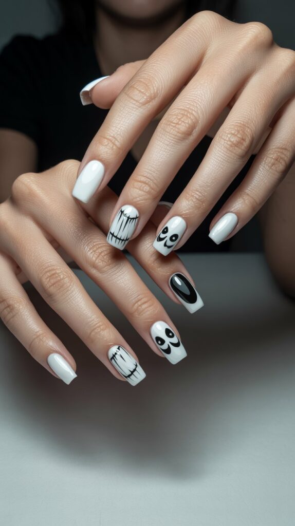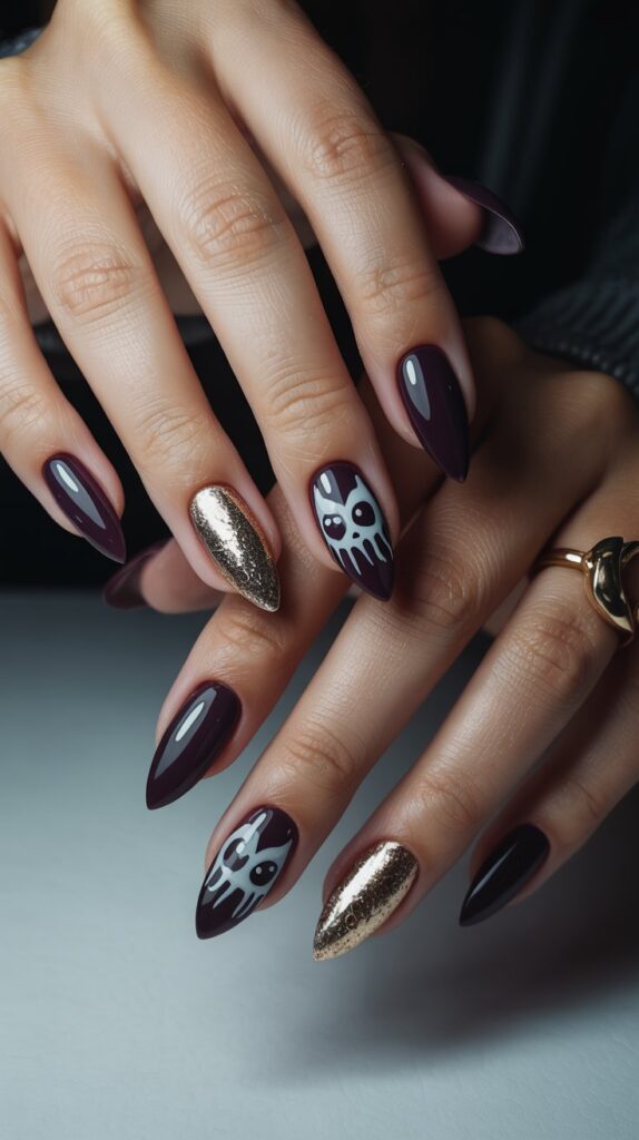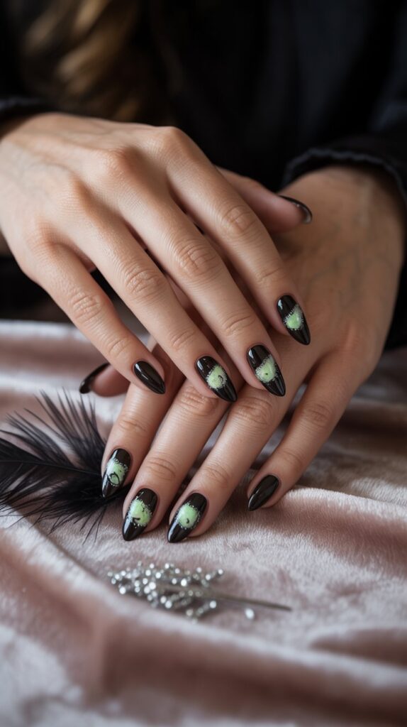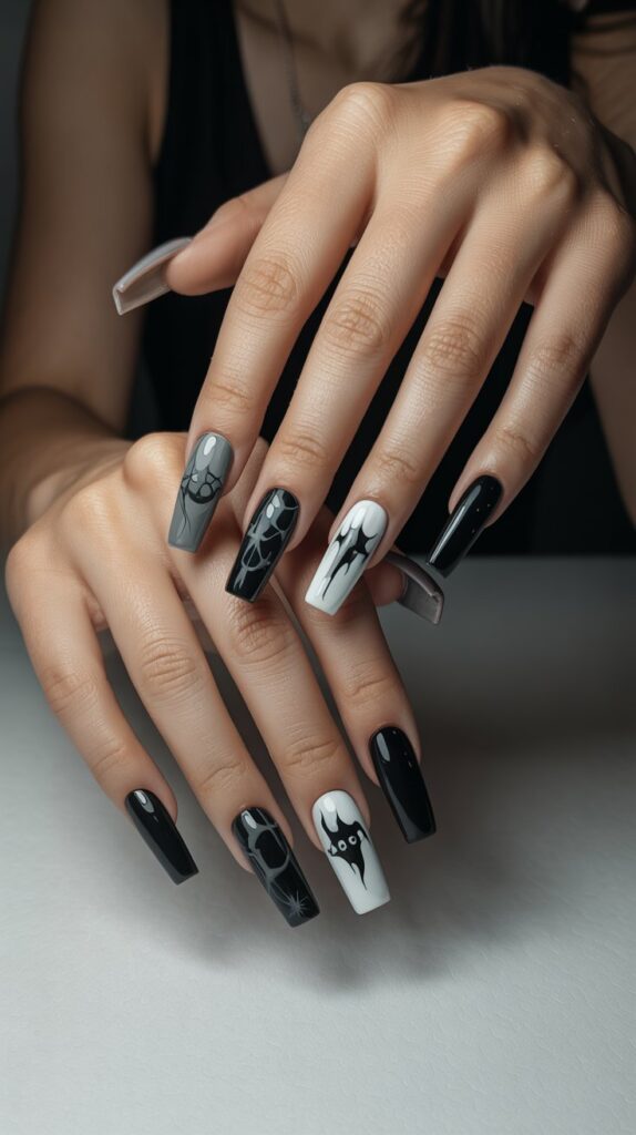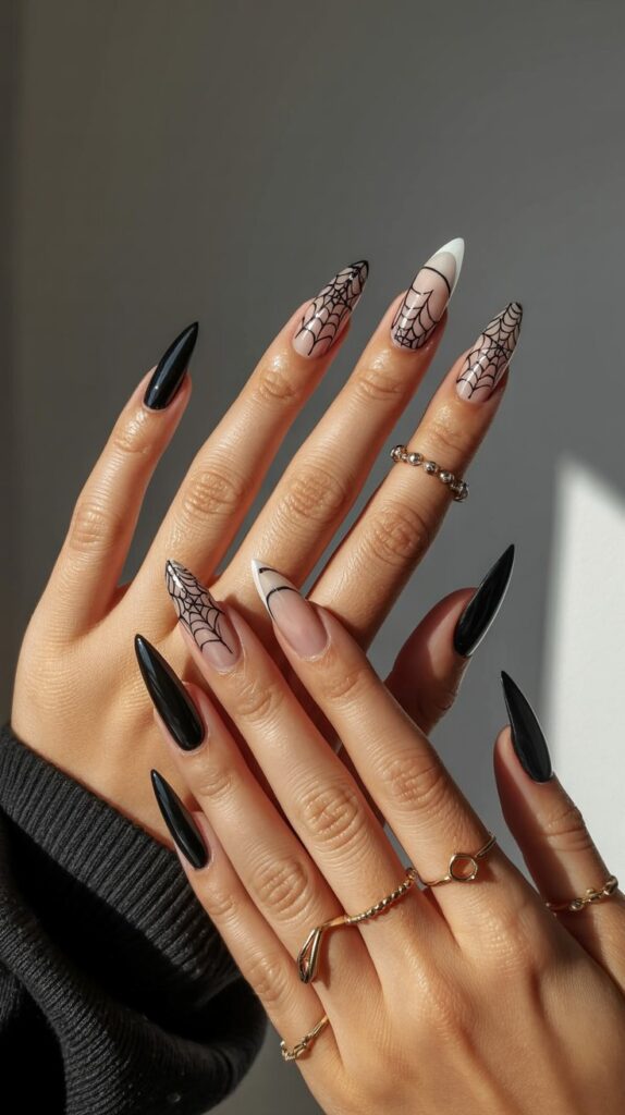• It focuses the spooky element on one nail, keeping the overall look balanced and chic.
